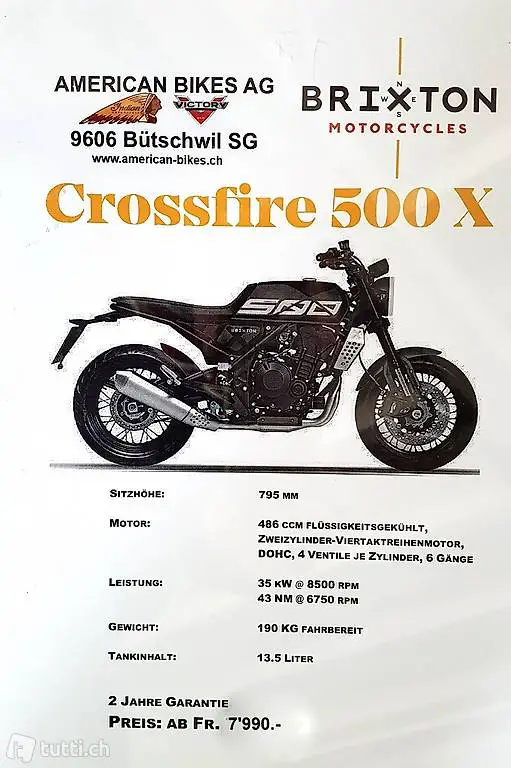 Neue BRIXTON 500X, 0 km, 486ccm, Zweizylinder-Reihenmotor, 4-Takt, 35kW, max. 160km/h, 190 kg., Sitzhöhe 795mm = kann angepasst werden. Ab Fr. 7'990, -