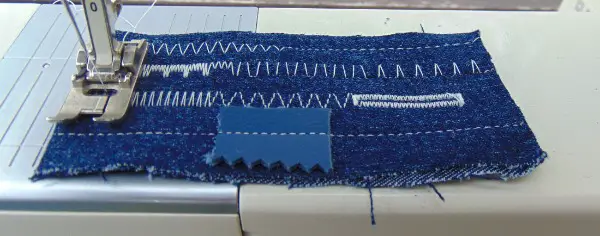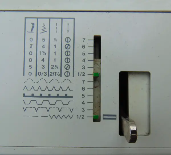 Mit 7 verschiedenen Stichprogrammen: Gerade, Zickzack, ausgenähte Bogennaht, Blindsaum, Muschelkantenstich, ... siehe Bild 2.