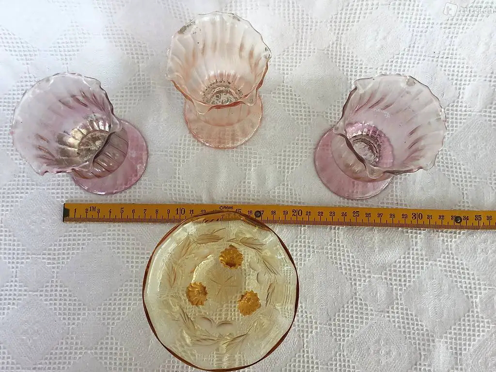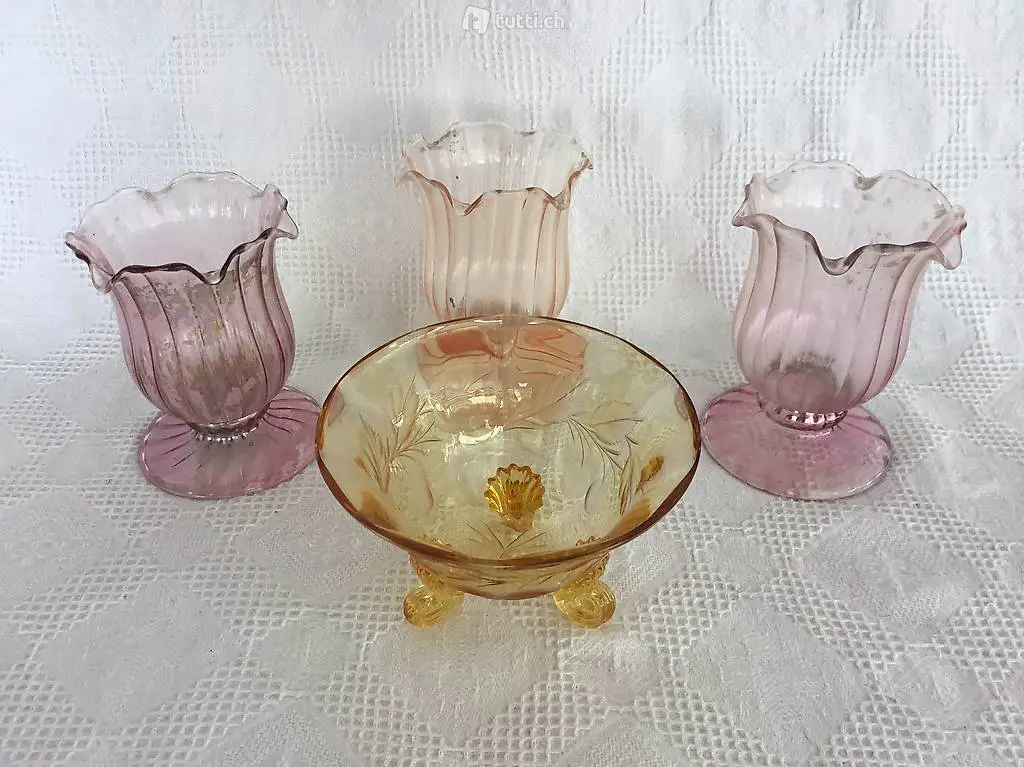 4 hübsche Glasobjekte in gebrauchten Zustand. Rosa ca 10 cm Hoch, für Blumen oder Teelicht. Sehr schöne effektvolle Dekoration. Porto CH 7.- kann auch abgeholt werden