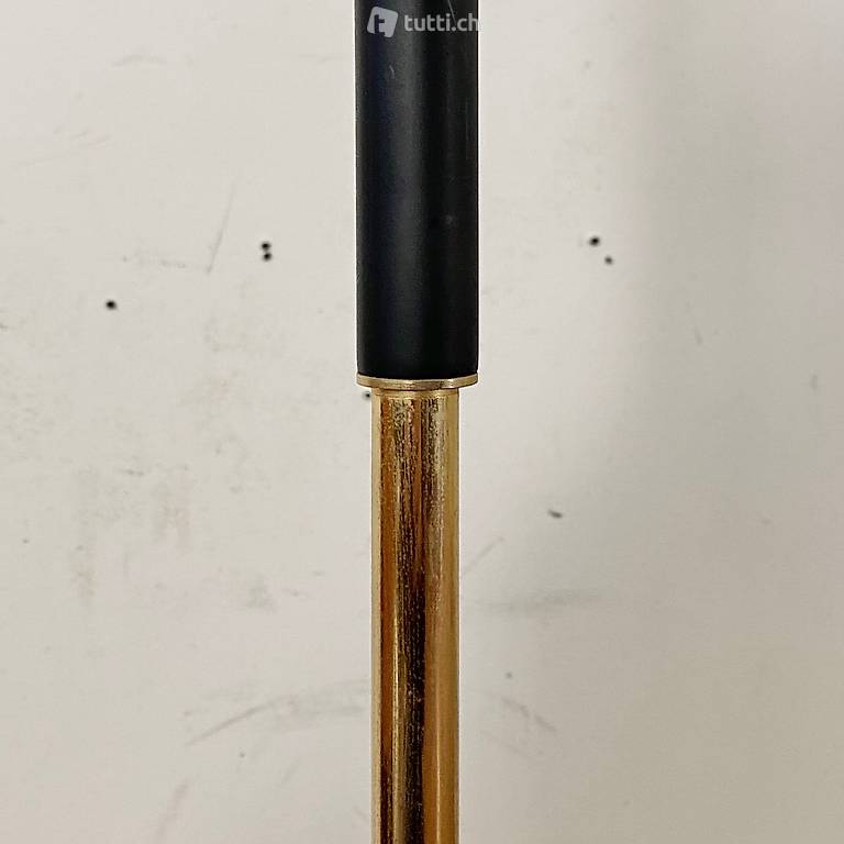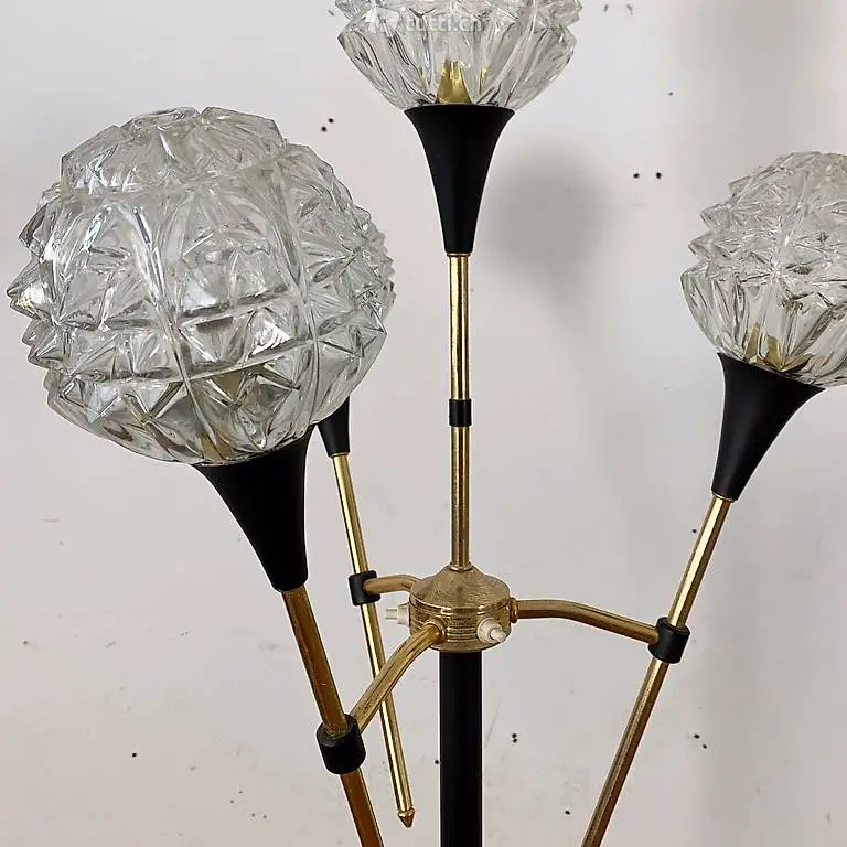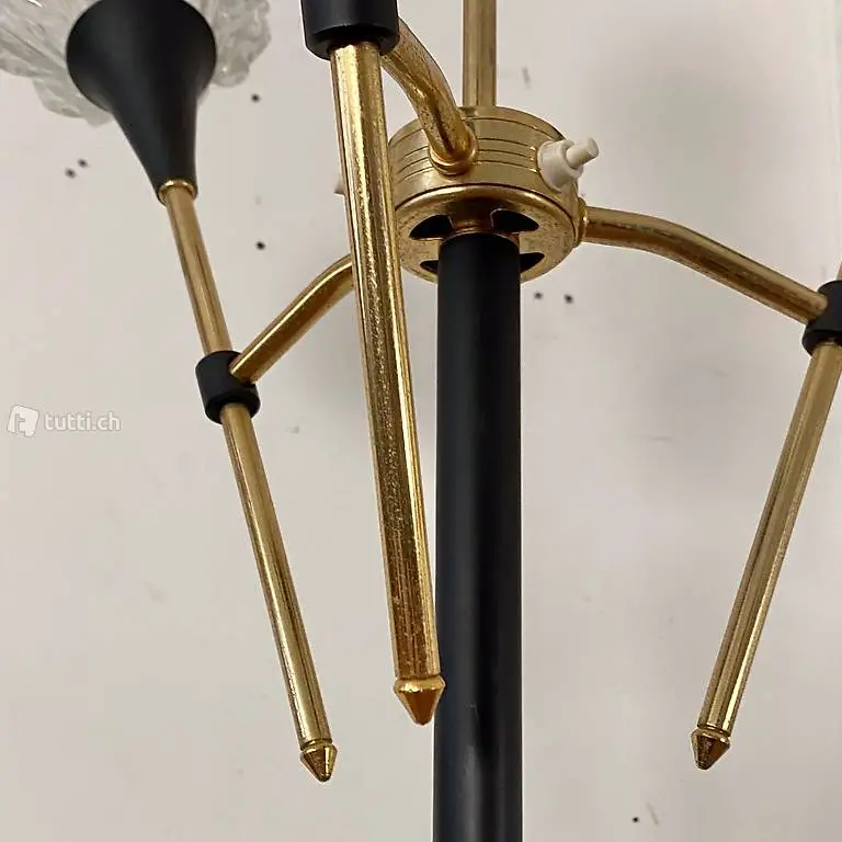 Stehleuchte mit 4 separat geschalteten Leuchten. Höhe 162cm Durchmesser ca. 50cm. Material Messing, Glas und schwarz lackiertes Metall, der Standfuss ist aus Gusseisen. Weitere Möbel vorhanden.