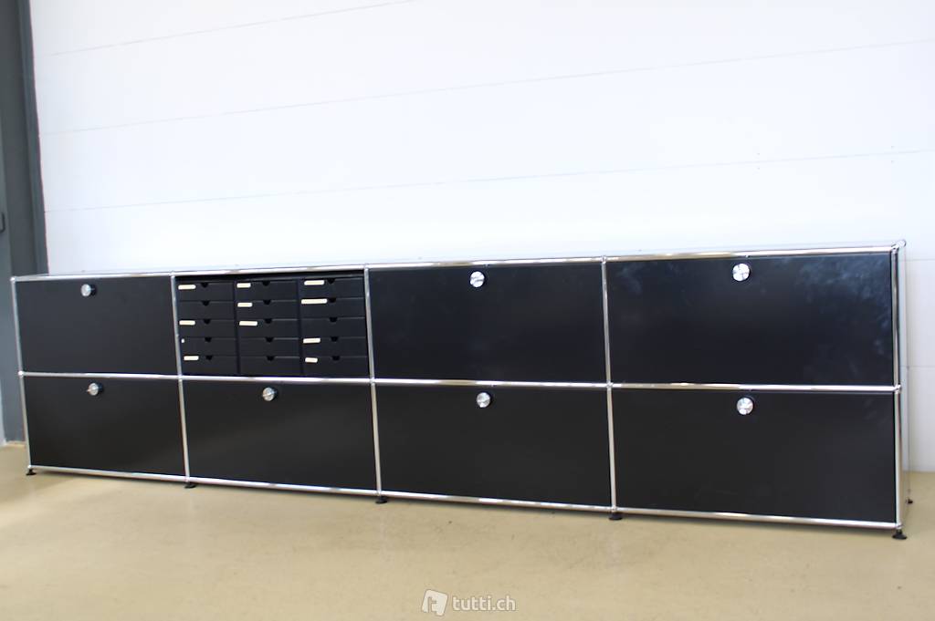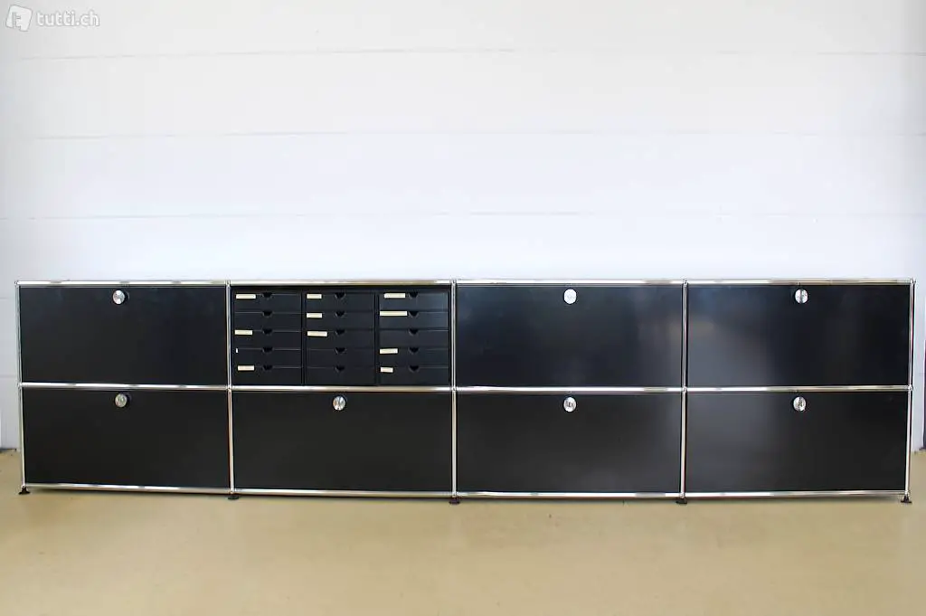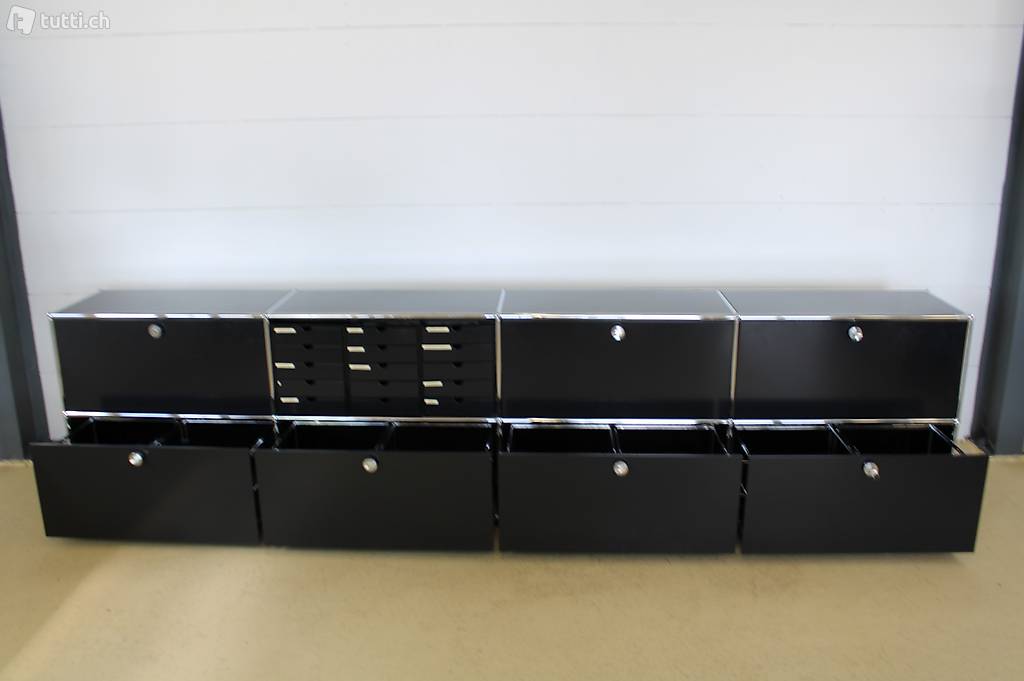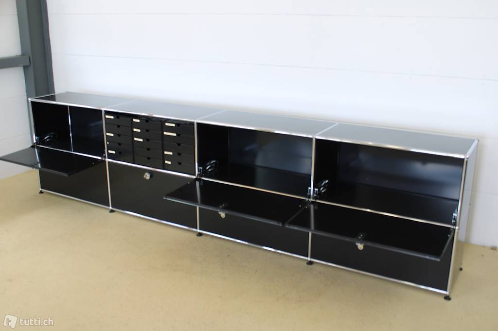 Ein schönes USM Sideboard in schwarz, welches gut erhalten ist. 3 Klapptüren, 4 Schubladen mit oder ohne Hängeregister, 1 offenes Fach mit Inos Schuladen. Neue Generation!