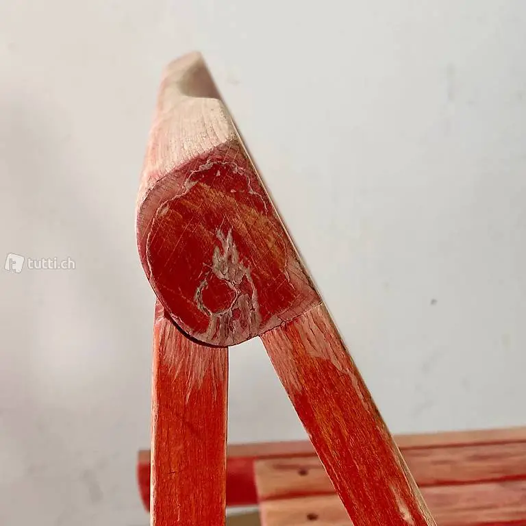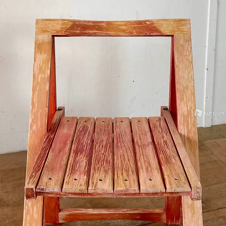 Aldo Jacober Stuhl aus den 60er Jahren. Der Stuhl, aus Buche Vollholz, ist zusammen klappbar. Die Lack Oberflächen sind stark verwittert. Technisch stabil und auch der Klapp Mechanismus funktioniert einwandfrei. Weitere Möbel vorhanden.