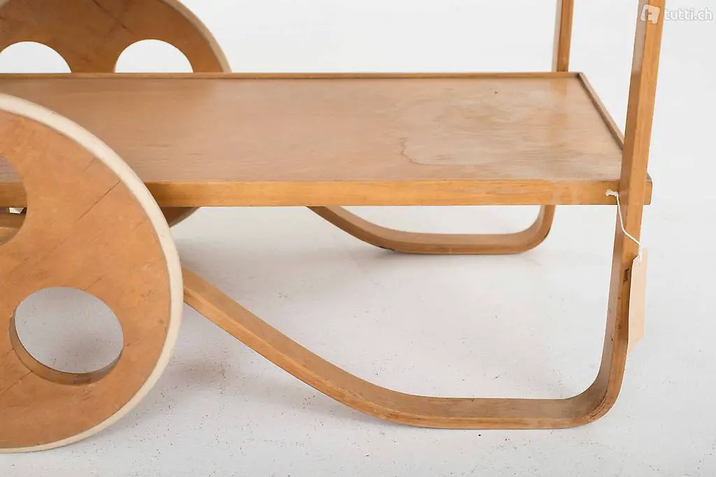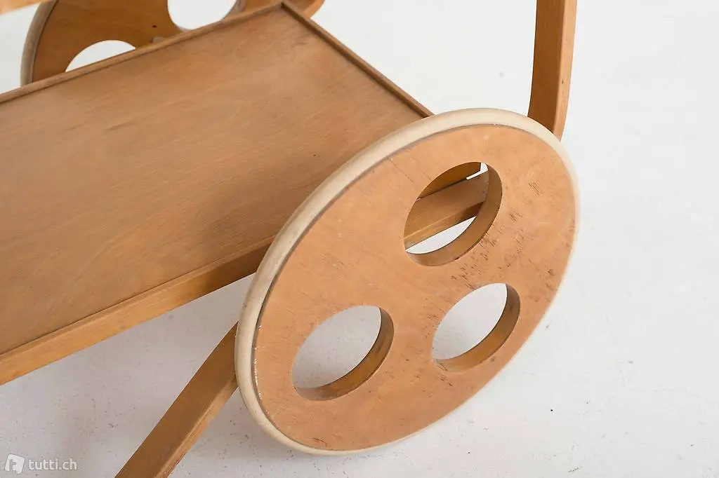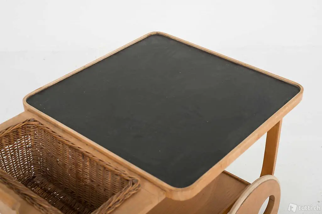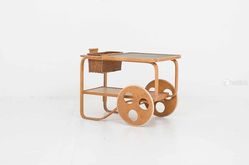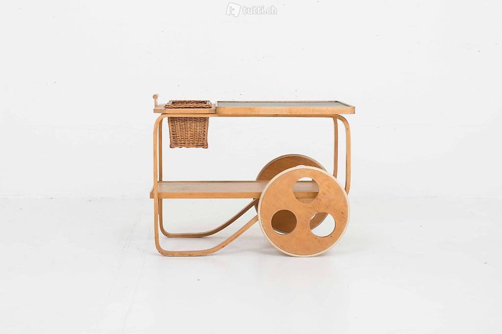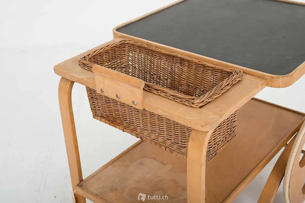 Dieser seltene und nur in kleiner Stückzahl produzierte Teewagen aus Birkenschichtholz stammt aus den 1930/1940er Jahren und ist voll funktionsfähig. Entworfen wurde er von Alvar Aalto, dem bedeutendsten finnischen Architekten und Möbeldesigners des 20. Jahrhunderts, produziert hat ihn die Schweizer Möbelfabrik Horgenglarus für Wohnbedarf. Der Weidenkorb lässt sich aus der Halterung entfernen. Der Teewagen befindet sich in einem schönen Vintage-Zustand mit altersbedingten Gebrauchsspuren.