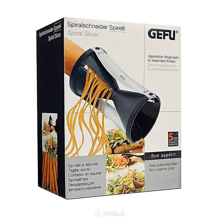 Spiralschneider Spirelli von GEFU zaubern Sie im Nu Julienne-Endlosstreifen aus Möhren, Rettich, Gurken, Zucchini und vielen anderen festen Gemüsesorten.