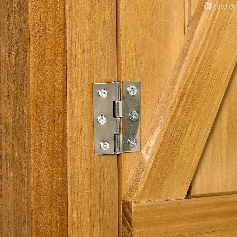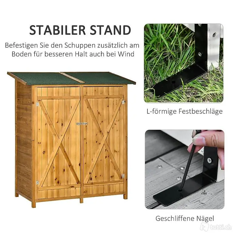 STABIL: Anders als andere Geräteschuppen kommt dieser Schuppen mit L-förmigen Festbeschlägen und Bodennägeln, mit denen man den Geräteschuppen am Boden befestigen kann. Das verstärkte Scharnier an der Tür verlängert die Lebensdauer.
