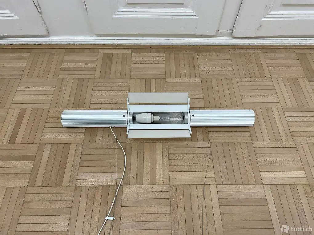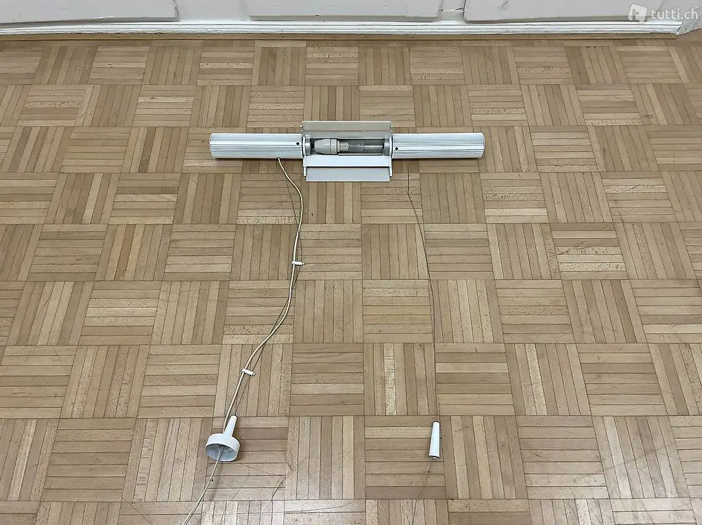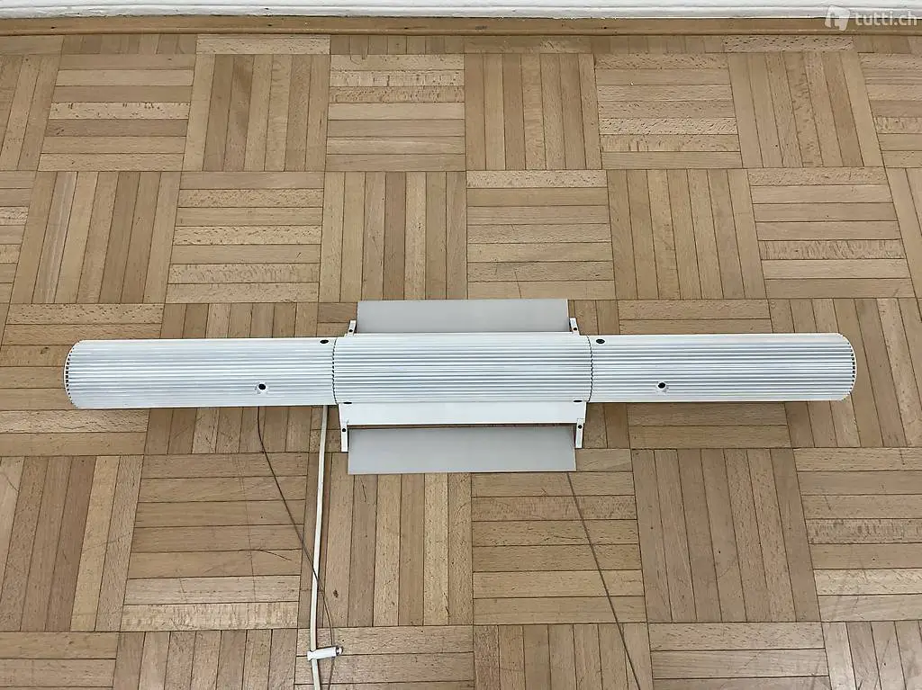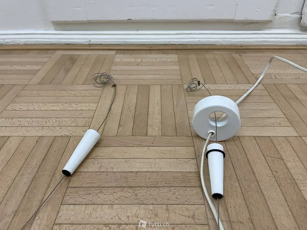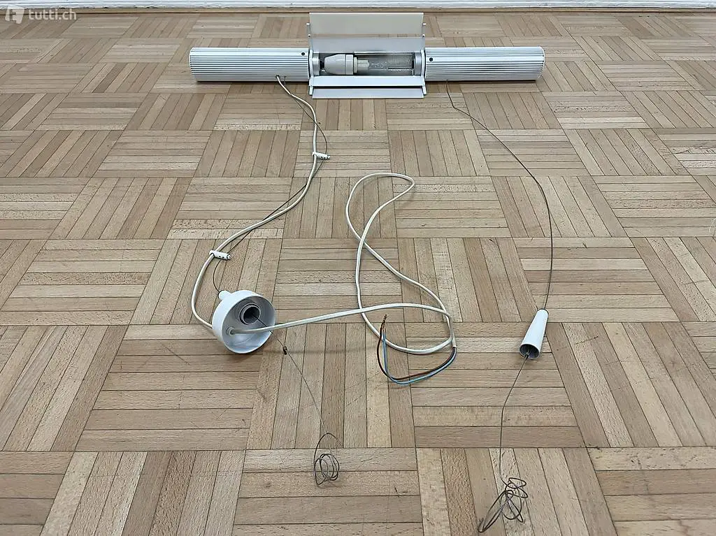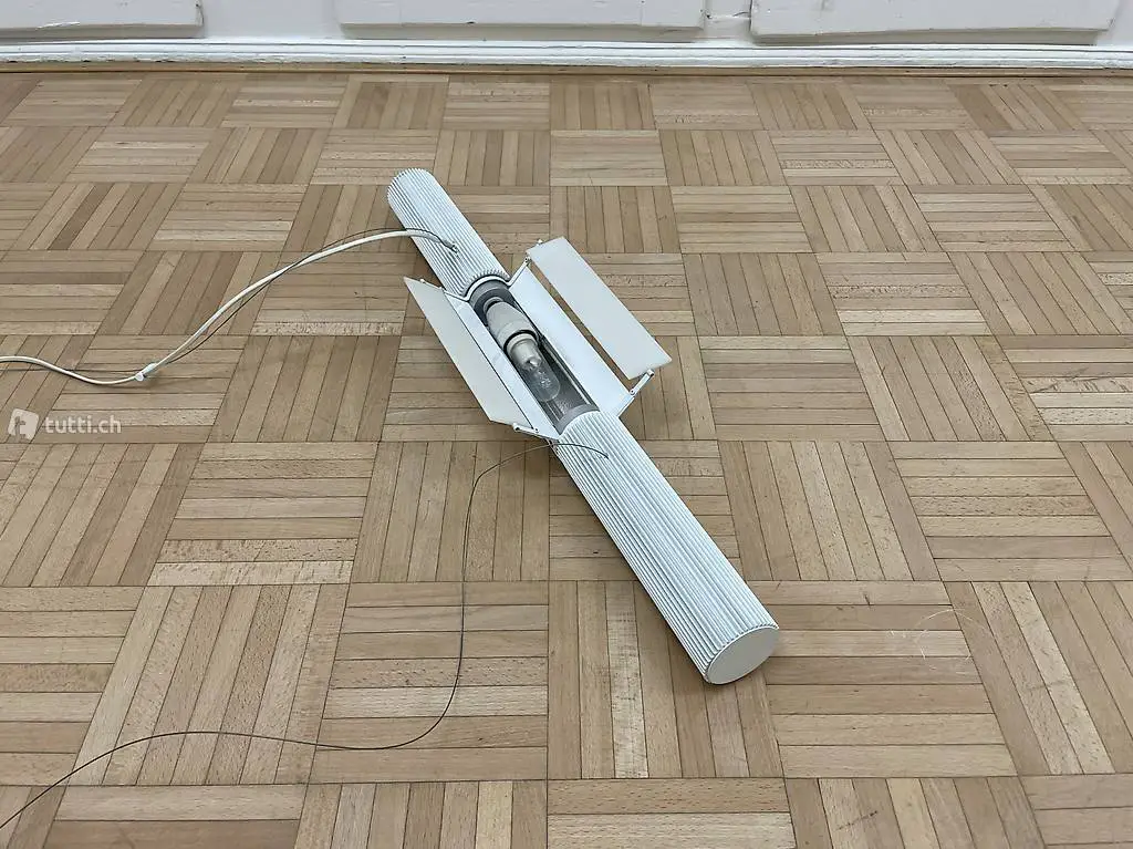 Es wäre auch noch eine Stehlampe (mit 2 drehbaren Reflektoren) und eine Tischlampe aus der selben Serie in weiss zu haben.