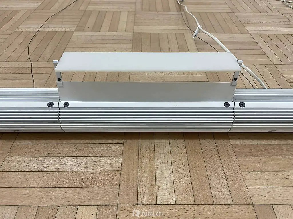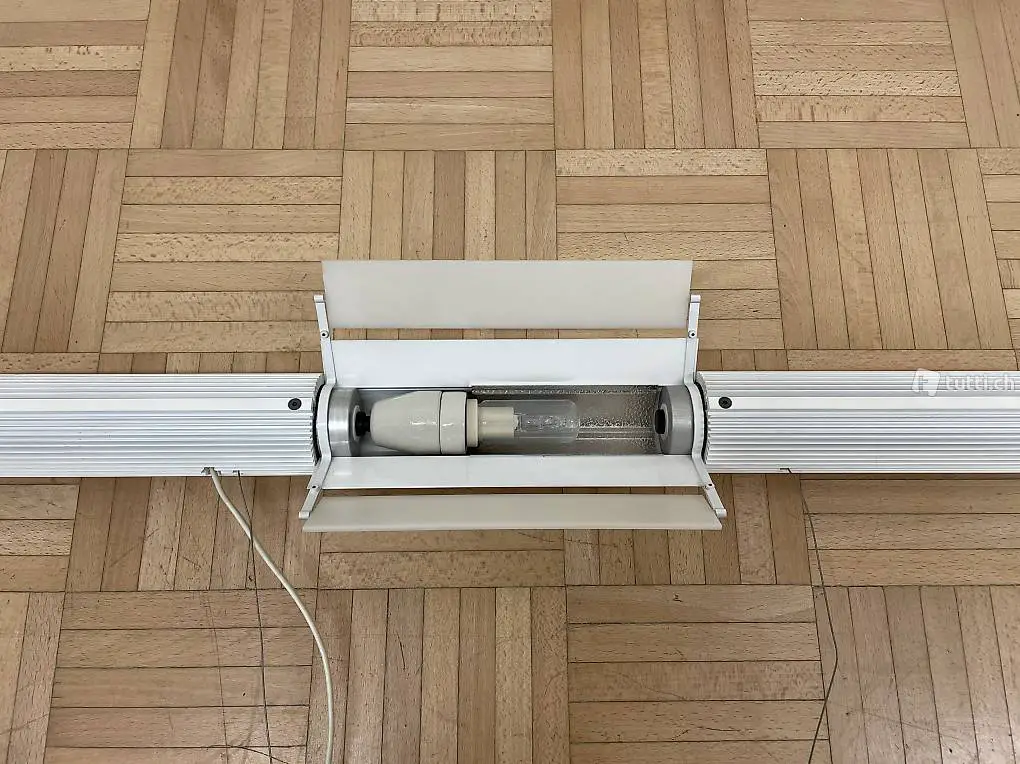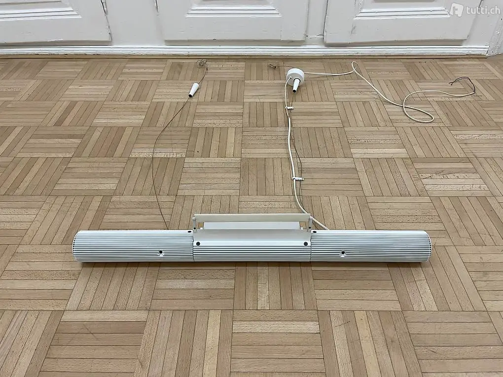 Ein Schweizer Designklassiker aus den 1970er oder 1980er: Sehr hochwertige und zeitlose Hängeleuchte von Swisslamps International. Es handelt sich um eine seltene Ausführung der Haloprofil Serie von V. Frauenknecht. Die mid century Lampe besteht aus einem länglichen Körper, der an zwei Drahtseilen mit konischer Blechsbdeckung aufgehängt wird. Highlight ist sicherlich der gerillte Reflektor aus massivem, weiss lackiertem Aluminium. Das Mittelstück mit zwei verstellbaren Acrylglaslamellen ist um 360 Grad drehbar. Die Siebziger Achtziger Jahre Designerlampe ist in (sehr) gutem Zustand mit kleineren Gebrauchsspuren. Die Pendellampe ist als Bürolampe oder Esstischlampe geeignet. Die mid century Leuchte ist sehr schön verarbeitet.