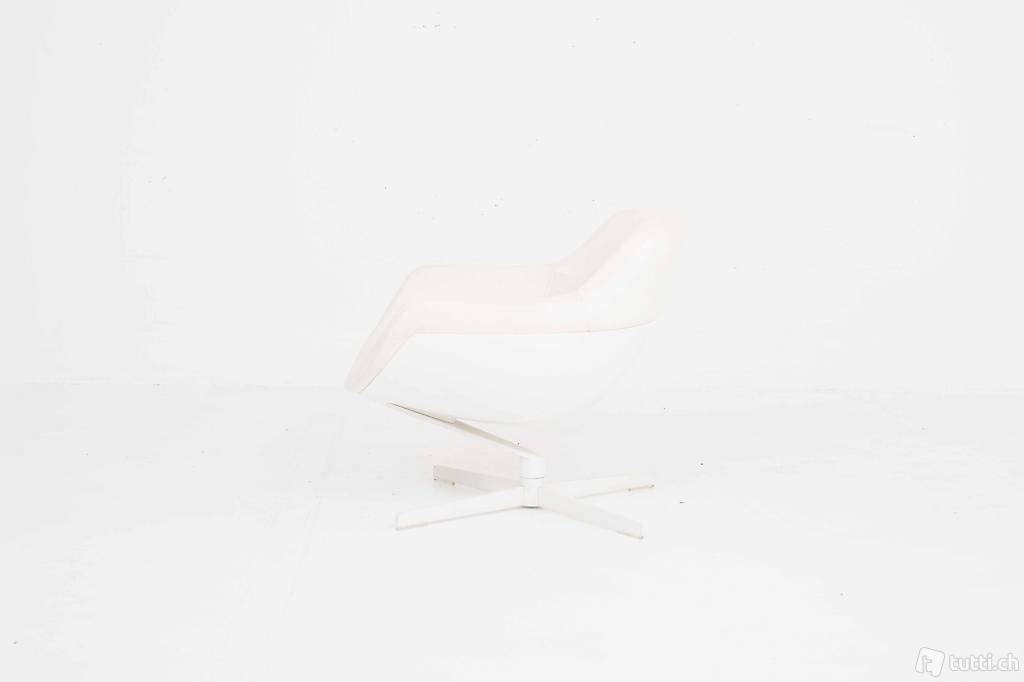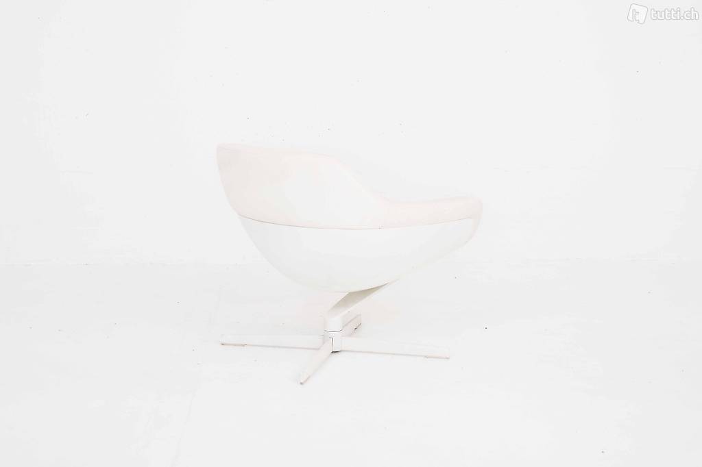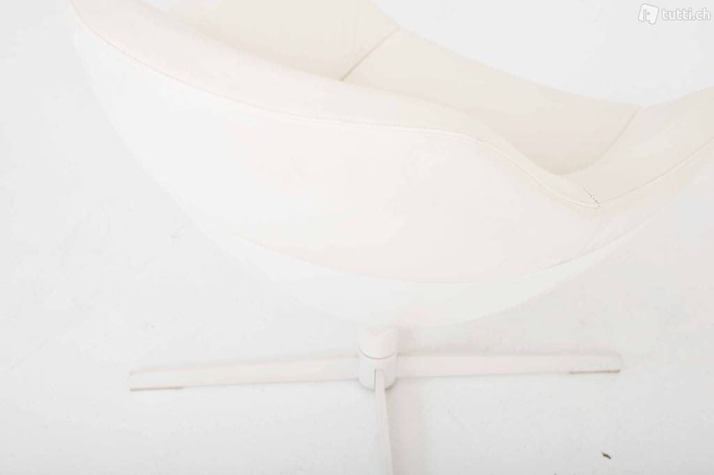 Dieser elegante Drehsessel stammt aus der Feder des französischen Designers Jean-Marie Maussaud. Der moderne Sessel besteht aus einer muschelähnlichen Sitzschale aus lackiertem Fiberglas und einer Lederpolsterung in Weiss, diese wird durch eine ausladende Platte mit dem Viersterne-Fuss verbunden. Der weisse Sessel befindet sich in einem gut bis sehr guten Zustand mit leichten Gebrauchsspuren.