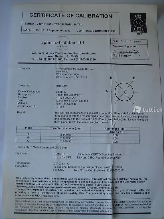Ball Assembly) aus Hartmetall (Tungsten Carbide) Klasse/Grade 5, für die Kalibrierung von Tastern auf der CMM Messmaschine. S/N 131483, mit Prüfzertifikat von UKAS und Verpackung.