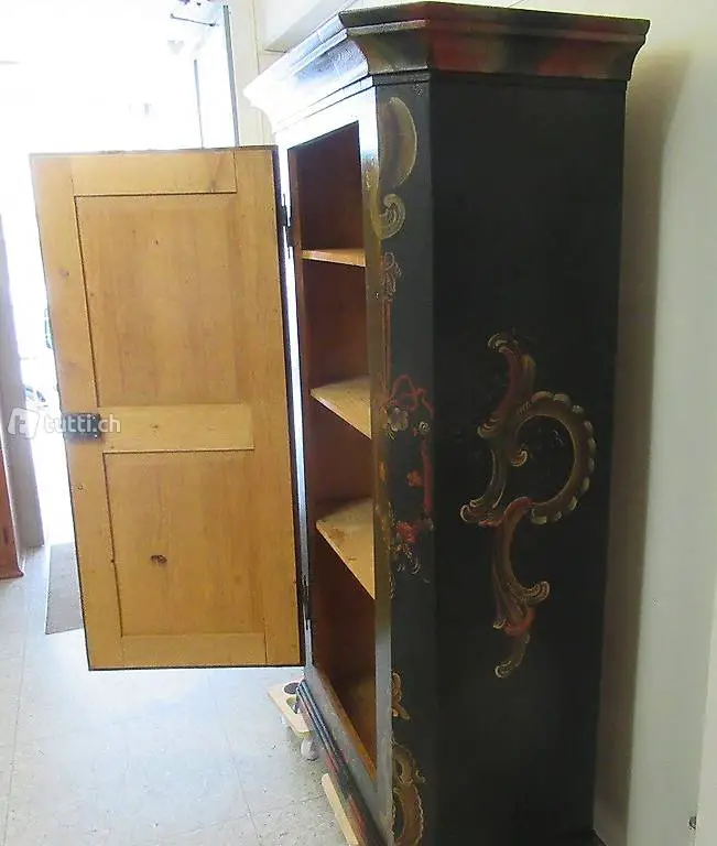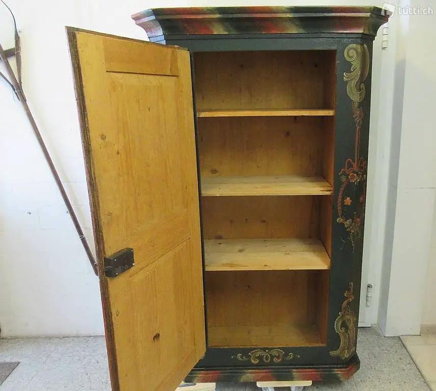 Appenzeller Schrank neugestaltet von vom bekannten Appenzeller Maler Markus Fischli (1921-2008) mit dunkelgrüner Grundfarbe im guten Zustand. Der wunderschöne Schrank stand bis vor kurzer Zeit im Pappelhof in Appenzell, den ältesten Haus von Appenzell. Es hat drei Tablare im Inneren. Masse: 111 x 54 x 178 cm.