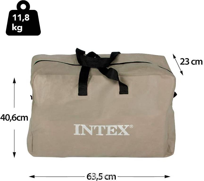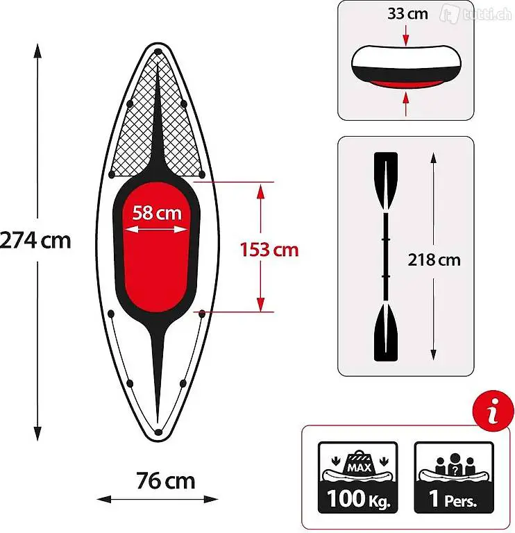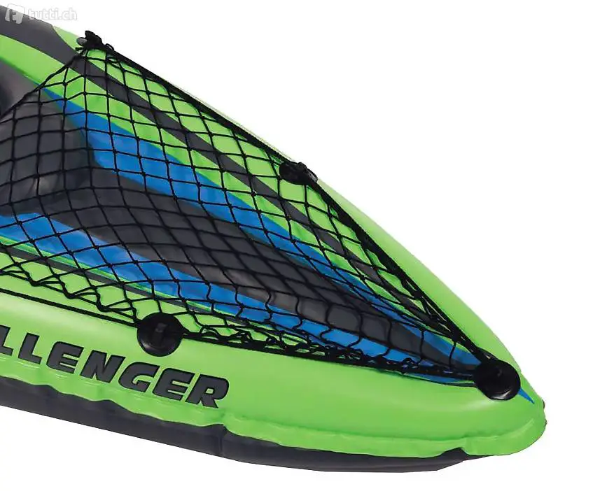 Das Frachtnetz bietet Stauraum für Ihre Ausrüstung und andere Gegenstände. Durch die Greifschnüre an beiden Enden lässt sich das Kajak ganz einfach transportieren und praktisch greifen, wenn Sie sich darin befinden. Die Lieferung beinhaltet ein aufblasbares Kajak, ein Aluminiumpaddel, eine Pumpe, ein Reparaturset und eine Aufbewahrungstasche.