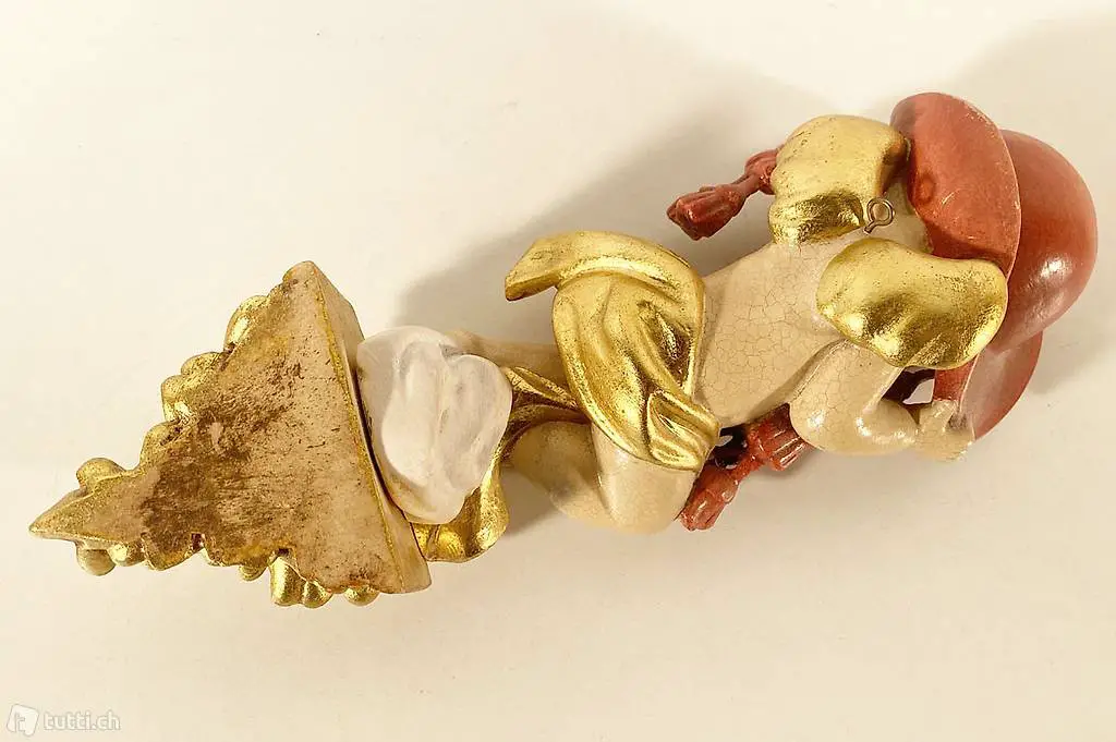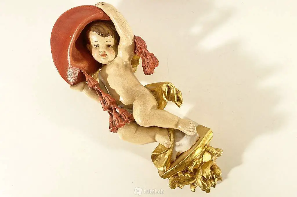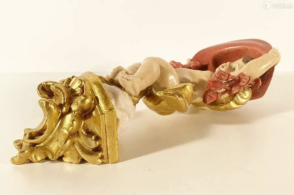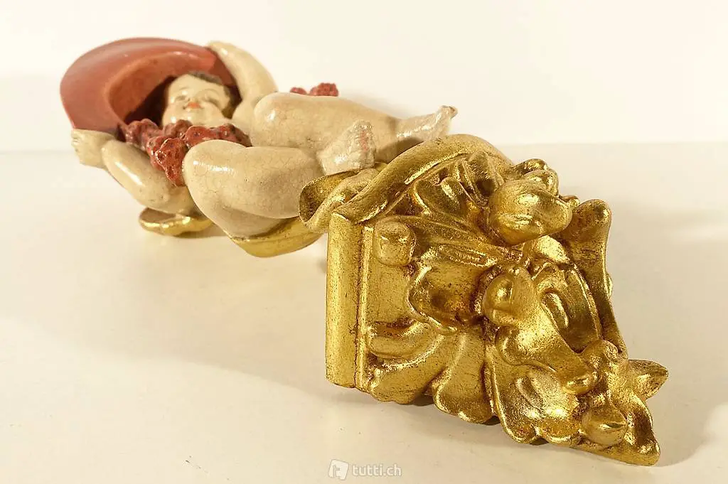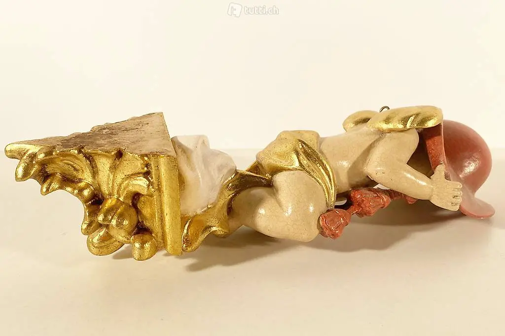 Barock Sockel. Die Putte ist in einem Top Zustand. Die Wandstatue ist 35 cm hoch, 13 cm breit und 8 cm tief.