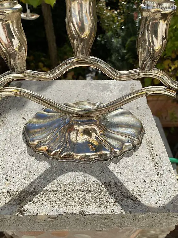 50er Jahre versilbert für 5 Kerzen, alle versilberten Artikel werden von mir unpoliert geliefert, ansonsten müsste ich die Preise höher machen.....Höhe 17 cm, Breite 32 cm,