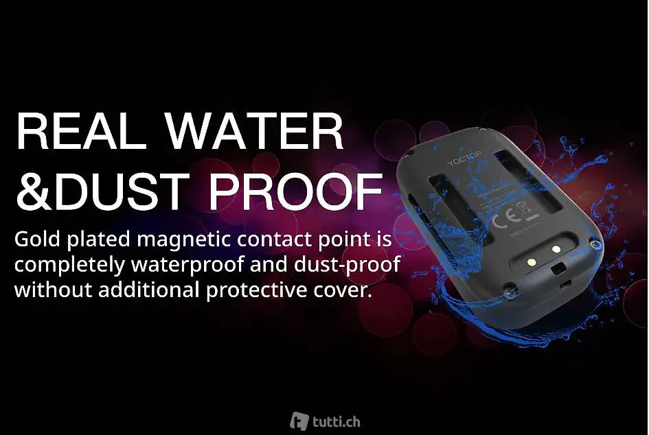 - Il punto di ricarica magnetico è completamente impermeabile e resistente alla polvere senza copertura protettiva aggiuntiva. Quindi, non ci sarà alcun rischio di perdite d'acqua a causa di un tappo di gomma non adeguatamente coperto.