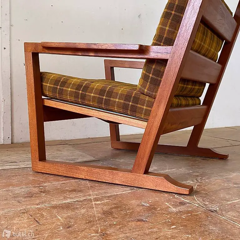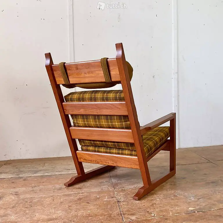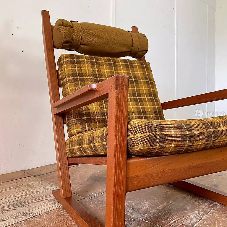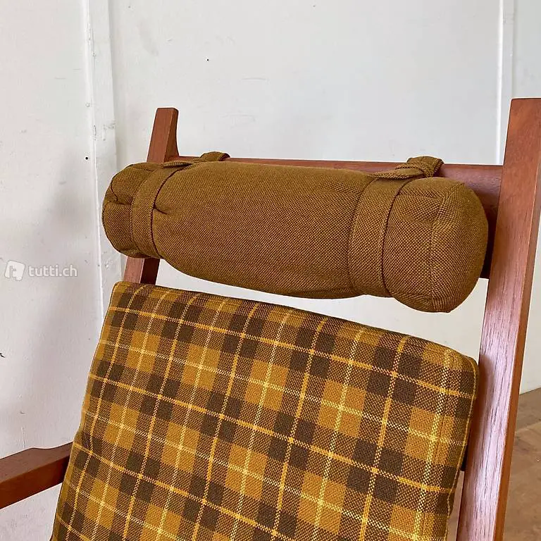 Teak Hochlehner Sessel mit Ottoman. 70cm breit 85cm tief, Höhe 98cm. Sitzhöhe 38cm. Der Ottoman misst 65x50cm Höhe 36cm. Der Stoff ist in sauberem guten Zustand, die Nackenrolle lässt sich in der Höhe leicht verstellen. Das Teakholz Gestell ist in schönem stabilen Zustand, mit minimalen Gebrauchsspuren der Zeit. Ein Hersteller ist uns nicht bekannt. Um die neuesten Möbel laufend zu sehen kann uns auch auf Instagram gefolgt werden. Unter: nicolalandert