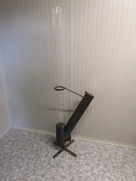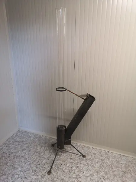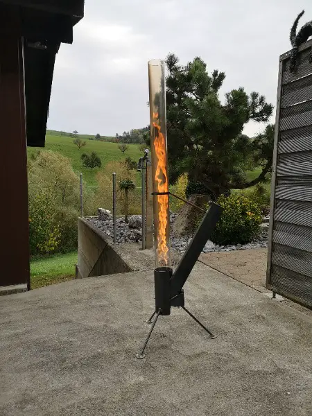 Die Pelletfackel wird mit Handelsüblichen Zündwürfeln und einem Feuerzeug angefeuert. Nach ca. 10min brennen die Pellets und es entsteht eine rotierende Flamme im Glasrohr. Die Pellets rutschen selbstständig vom Vorratsbunker in die Brennkammer. Die Brenndauer bis zum nachfüllen der Pellets beträgt ca. 1h.