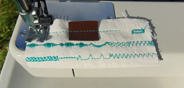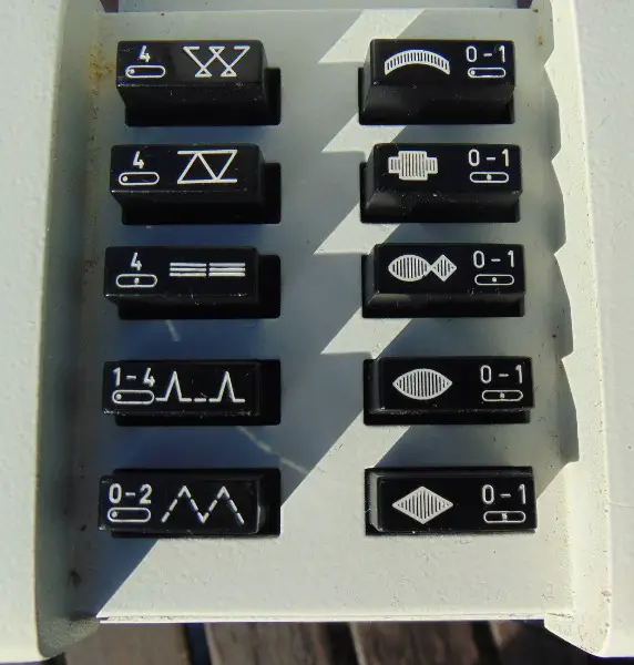 Mit diversen Stichen: Gerade, Zickzack, ausgenähter Zickzack (elastisch) , Hexenstich, dreifach Gerade, geschlossener Overlock, Zierstiche, .... mit Kombinationen (zwei Knöpfe gedrückt auf einmal) lassen sich viele verschiedene Stiche nähen (Druckknöpfe siehe Bild 2) .