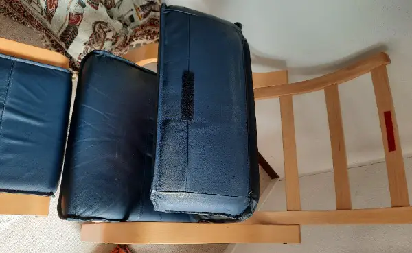 er ist sehr praktisch: das dunkelblaue Polster des Sessel ist mit Klettverschluss am Holzrahmen angemacht. Es lässt sich abnehmen und waschen.