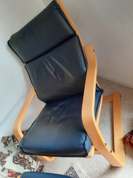 bequemer Design Wipp-Sessel mit Schemel; Holz und Leder