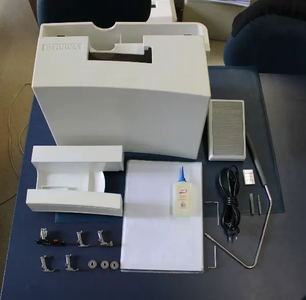 Bedienungsanleitung, 6 Nähfüsse, 4 Spulen, Kantenlineal, Kniehebel zum Nähfussheben, ... siehe Bild 5.