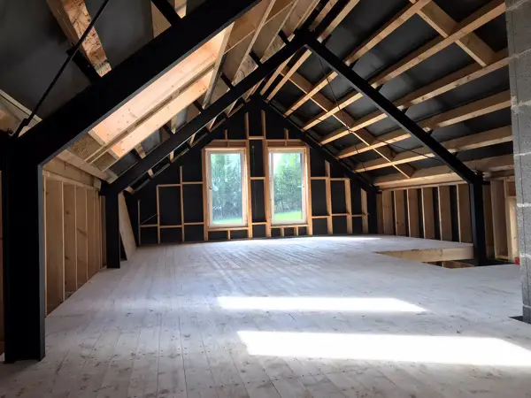 - Volle Nutzung der nutzbaren Fläche, da für den First selbst keine Binder benötigt werden.