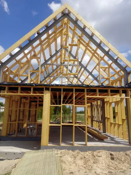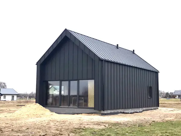Platte gibt. Die Sparren werden mit Dach, Wänden und Giebeln in einem Abstand von 8 cm von der Struktur verschraubt, so dass bei der Installation von Innenstrukturen ein Rahmen mit Pappe, Gips oder Verkleidung oder anderen Materialien hinter der Struktur eingesetzt werden kann, und dies gibt uns die vollständige Beseitigung des Kontakts zwischen der Struktur und dem Frost. Dachfolie wird auf Dach- und Wandsparren aufgebracht, dann Lattung und Konterlattung. Dann decken wir das Dach mit Blech oder anderen Materialien und die Wände mit Blech,