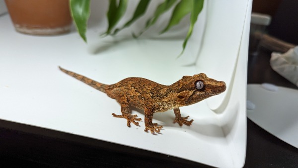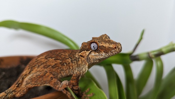Ein schöner Höckerkopfgecko-Herr (Rhacodactylus Auriculatus) mit roter Grundfärbung sucht ein neues zu Hause. Er hat das Muster "retic".