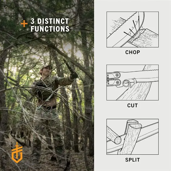 Das einzigartige Design ermöglicht dem Benutzer drei verschiedene Funktionen in einem kompakten Paket: Hacken, Schneiden und Schlagstock.