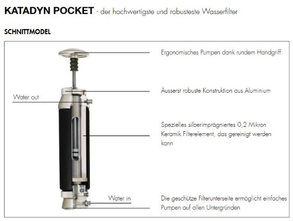 Der robuste Katadyn Pocket ist ein Keramik-Tiefenfilter gegen Bakterien, Protozoen und andere Krankheitserreger. Die Poren der Filterkeramik (Porengrösse 0.2Mikron = 0.0002mm) sind kleiner als die Mikroorganismen-