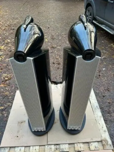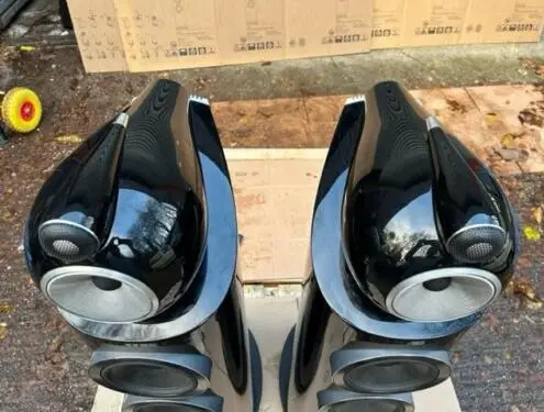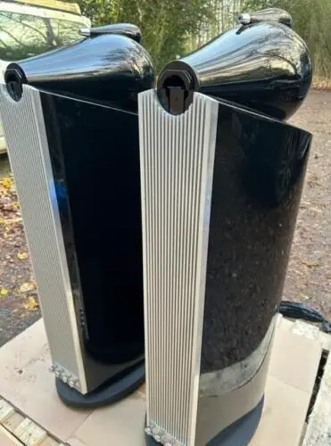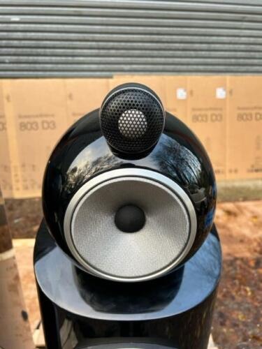 B&W 803D3 Lautsprecher in Schwarz, verpackt mit Gittern und Spikes