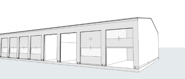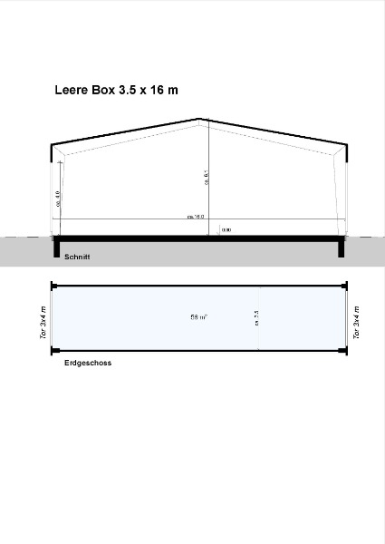- 3.5m breite Boxen sind vom Freien durch ein Industrietor 3.0 x 5.0 m zugänglich.