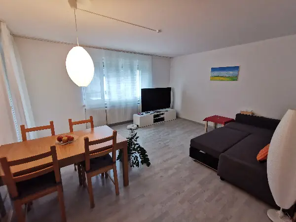 - Wohnzimmer mit Esstisch, Sofa und Fernseher