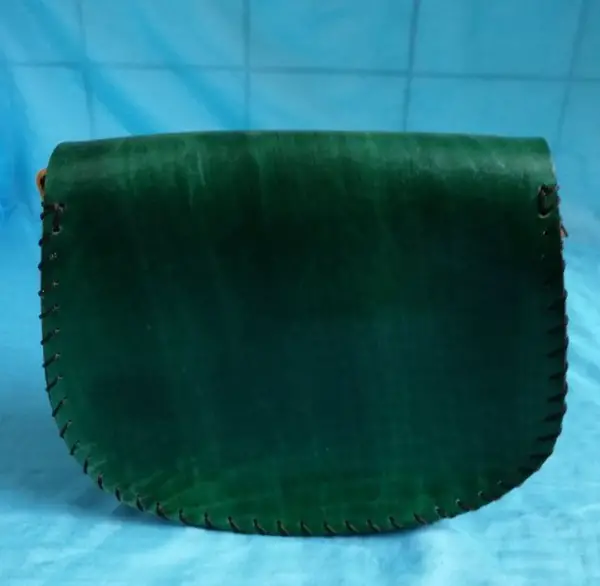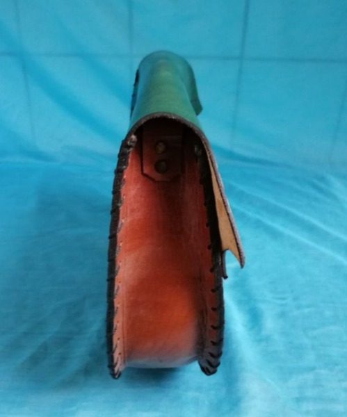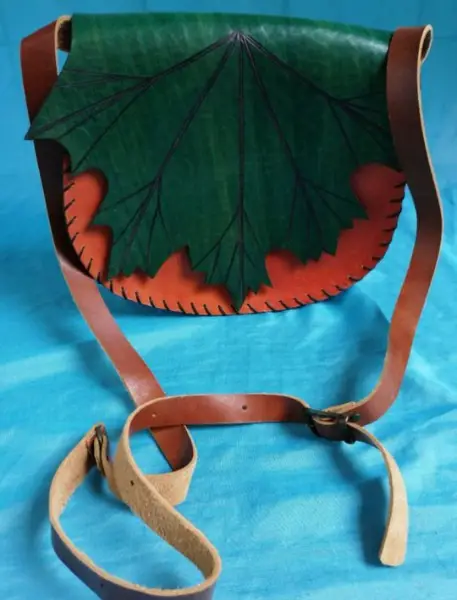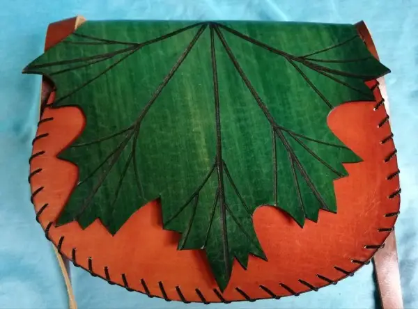 Leder, vorne in schöner Blattform. Handarbeit, markenlos. Grün/Orange/Braun. Ohne Futter, siehe Fotos. Gebraucht, guter Zustand. Ca. 24 cm breit, ca. 21 cm hoch. Breite unten, ca. 5 cm.