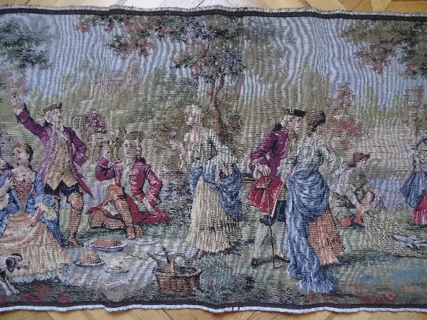 Wunderschöner, grosser, neuwertiger, geruchsfreier Gobelin mit einem barocken Motiv aus dem 18. Jahrhundert; Adelsgesellschaft beim Picknick