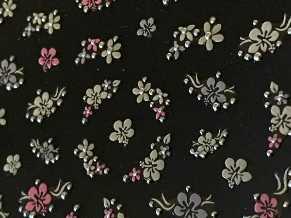 Gothic Blumenornamente mit Glitzersteinchen. Die Motive einfach von der Karte abziehen und auf den gereinigten Nagel (muss fettfrei und sauber sein) kleben. Um die Haltbarkeit zu verlängern, mit Klarlack versiegeln. Die Motive sind transparent und zur besseren Darstellung auf dem Bild vor einem dunklen Hintergrund.