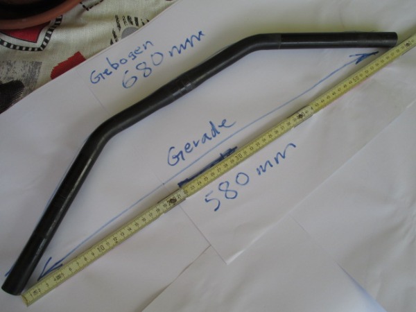 MTB Aluminium, Occasions Trico Lenker. Gerade Spannweite 580 mm. Gebogene Spannweite 680 mm. Durchmesser Mitte (Klemmung 25mm) . Seitenende Rechts und Links 22 mm Durchmesser. Abholpreis.Vorkasse.Versand möglich.