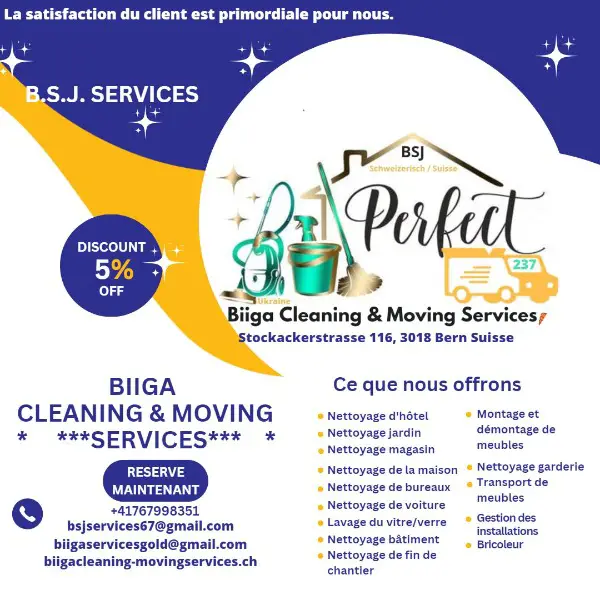 - Nettoyage (Appartement, Immeuble, Magasin, Bureau, Garderies, Hôtel, Espaces prives, Jardin, Vitres et des stores, Parking auto, Stadium, Ecole, Fin de chantier, Foires & expositions, de Printemps, ...)