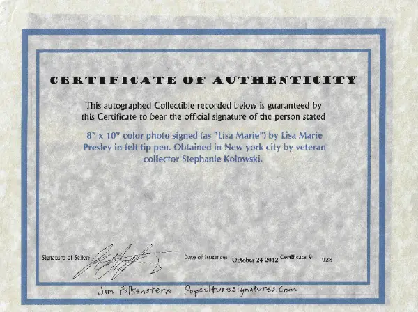 Original Autogramm auf Foto (Format 20x25) ! Unterschrieben von Lisa Marie Presley mit "Lisa Marie" mit silbernen Edding! Inkl. Echtheitszertifikat