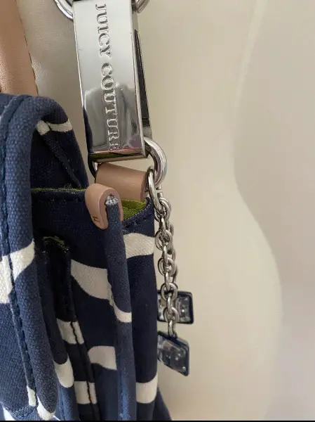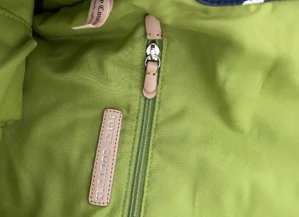 Leder. Das Innenfutter ist grün-farben mit Juicy-Logo-Print. Im Inneren befinden sich drei Fächer, eines davon mit