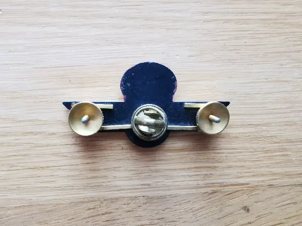 Feuerwehr Emblem aus Messing, Breite 5,7 cm, Höhe 2,9 cm, Dicke 6 mm, Befestigung mit zwei Gewindebolzen und Rändelmuttern.