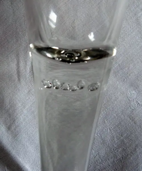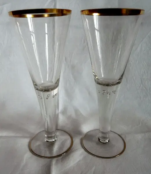 Glas, Schaft mit 7 eingestochenen Luftblasen, trichterförmig, Ziervergoldung. Josephinenhütte, Entwurf Arthur Gerlach, ca. 1910-20. Höhe 23,5 cm, Mündung 9 cm, Fuss 8,5cm