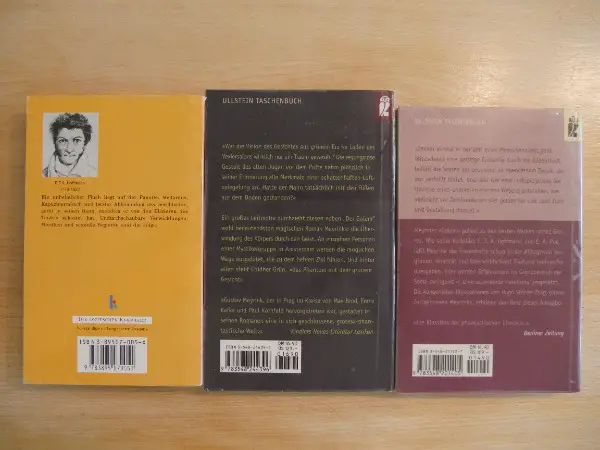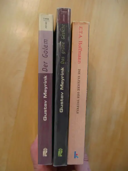 Bücher sind in gutem bis sehr gutem Zustand. Das Buch von Hoffmann ist etwas stärker beansprucht (Knickfalten, Abrieb an den den Kanten) . Die Bücher von Meyrink wurden von mir in Klebefolie eingebunden.