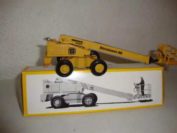 Verkaufe eine Hebebühne Grove MZ76 vom Hersteller NZG Nr 256 im Masstab 1:50 mit der Firmenaufschrift Stirnimann in einem guten zustand in der original Verpackung Vorauszahlung zuzüglich 8.50 Versand.