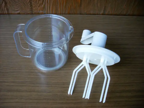 Robot mélangeur manuel avec bol gradué à 1 litre, en plastique, pour émulsionner les oeufs, la crème, ou autres préparations.