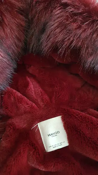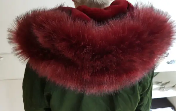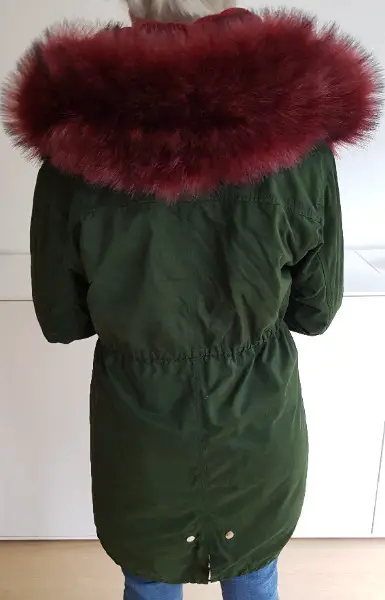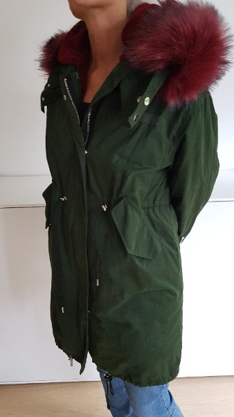 Reissverschluss rausgenommen werden. Am Rand der Kapuze hat es einen flauschigen, langhaarigen Webpelz in passendem rot zum Innenfutter, kann ebenfalls abgenommen werden. Schlupftaschen und Kordelzug.
