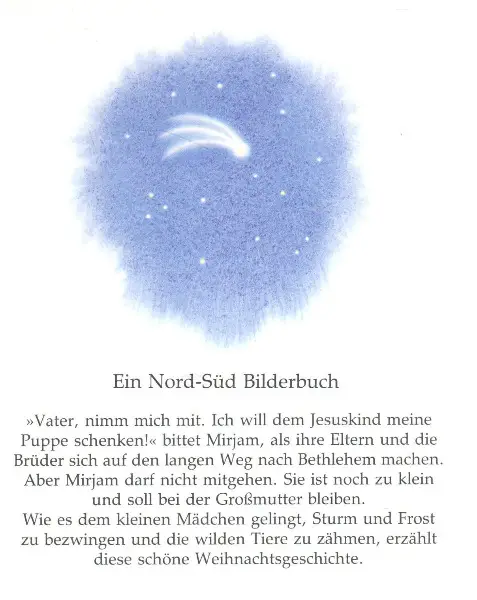 Kurzinfo: "Vater, nimm mich mit. Ich will dem Jesuskind meine Puppe schenken! " bittet Mirjam, als ihre Eltern und die Brüder sich auf den langen Weg nach Bethlehem machen. Aber Mirjam darf nicht mitgehen. Sie ist noch zu klein und soll bei der Grossmutter bleiben.
