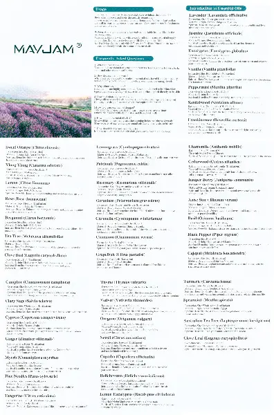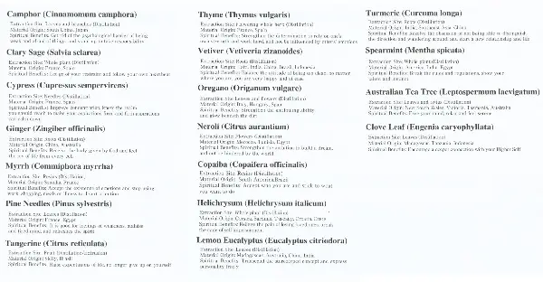 Lavender, Lemon, Lemongrass, Lemon Eucalyptus, Myrrh, Neroli, Oregano, Patchouli, Pepperminz, Rose, Rosemary, Sandalwood, Spearmint, Sweet Orange, Tangerine, Tea Tree, Turmeric, Vanilla, Vetiver, Ylang Ylang.