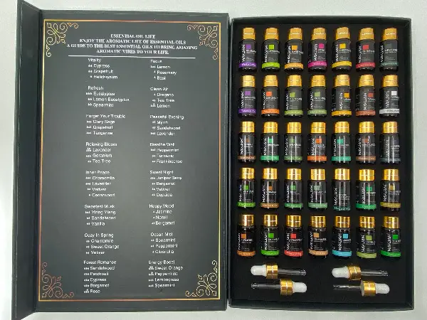 35 Flaschen mit jeweils 5ml Ätherischen Ölen mit 4 Pipetten in einer tollen Geschenkbox.