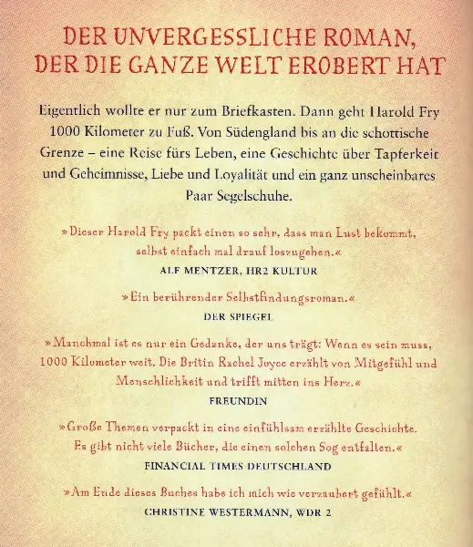 Eigentlich wollte er nur zum Briefkasten. Dann geht Harold Fry 1.000 Kilometer zu Fuss. Von Südengland bis an die schottische Grenze - eine Reise fürs Leben, eine Geschichte über Tapferkeit und Geheimnisse, Liebe und Loyalität und ein ganz unscheinbares Paar Segelschuhe.