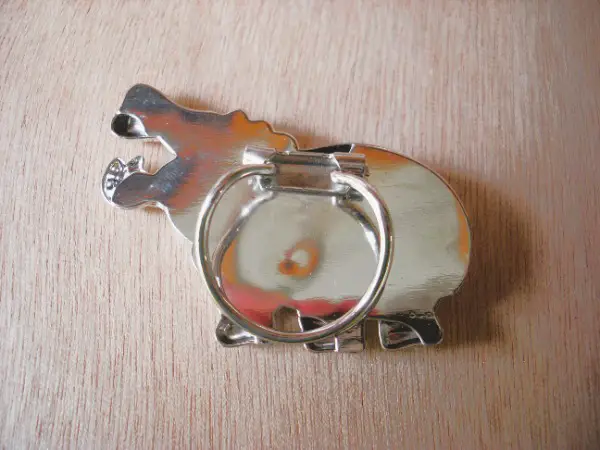 Broche ou pince à foulard en métal gris représentant un hippopotame.